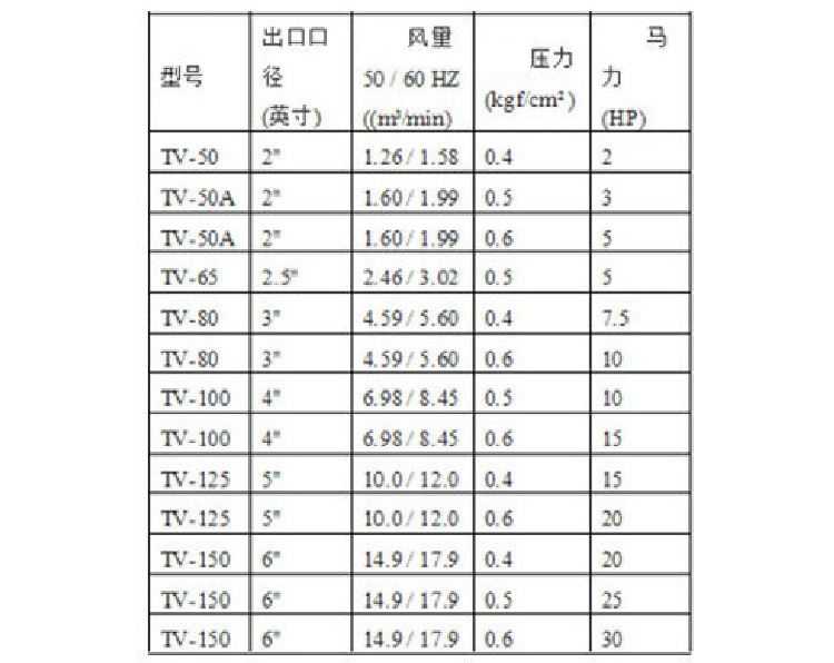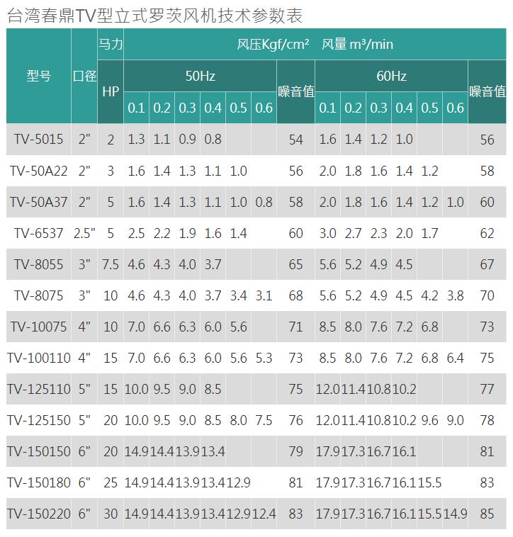 六.春鼎TV型直立式羅茨風機產品規格: 壓送用途適用壓力∶0 ~ 0.6 kgf/cm2 2 ~ 30HP另外可依特殊材質指定設計TV型直立式羅茨鼓風機產品特性較低的能源損耗∶春鼎TV型直立式羅茨鼓風機的設計能減少逆流對轉子的壓力, 相對也能減少對能源的損耗。較低的噪音∶壓力脈沖是主要的噪音源,春鼎直立式羅茨鼓風機相較于皮帶式羅茨鼓風機能有效降低噪音達五分貝。減免經常性之保養困擾∶春鼎直立式羅茨鼓風機采用直結式傳動,可減免皮帶之經常性損耗保養及機氣漏油之困擾。機器體積小,不占空間∶春鼎直立式羅茨鼓風機體積小,不占空間,而出氣口可依現場環境調整方向,安裝容易。裝置簡單∶裝置簡單、省工時、不占空間、不需隔音設備┅┅即達成低噪音之生活空間