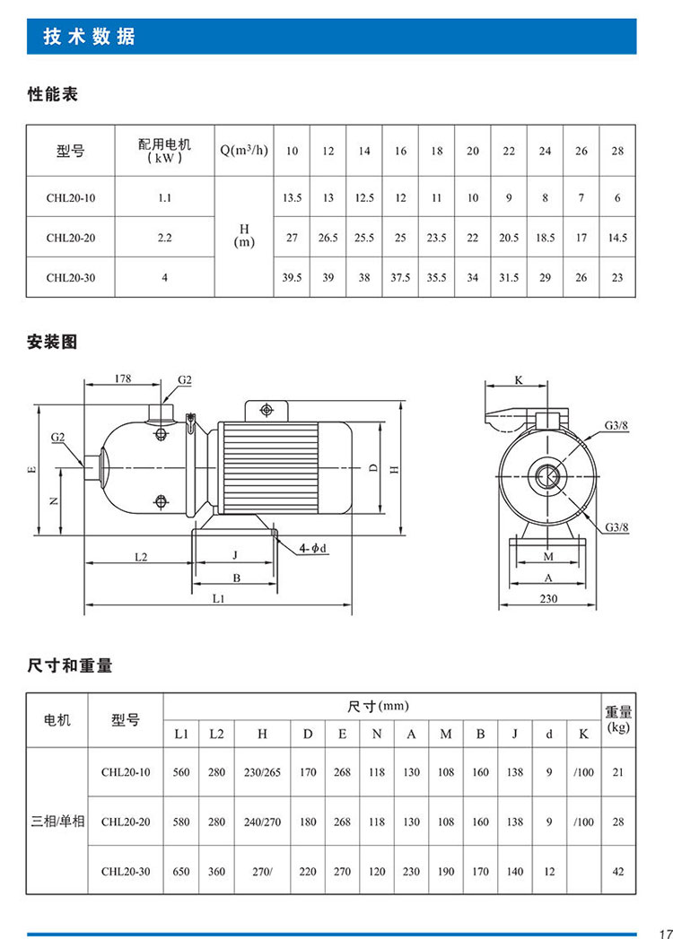 南方離心泵CHL20系列型號參數如下:
