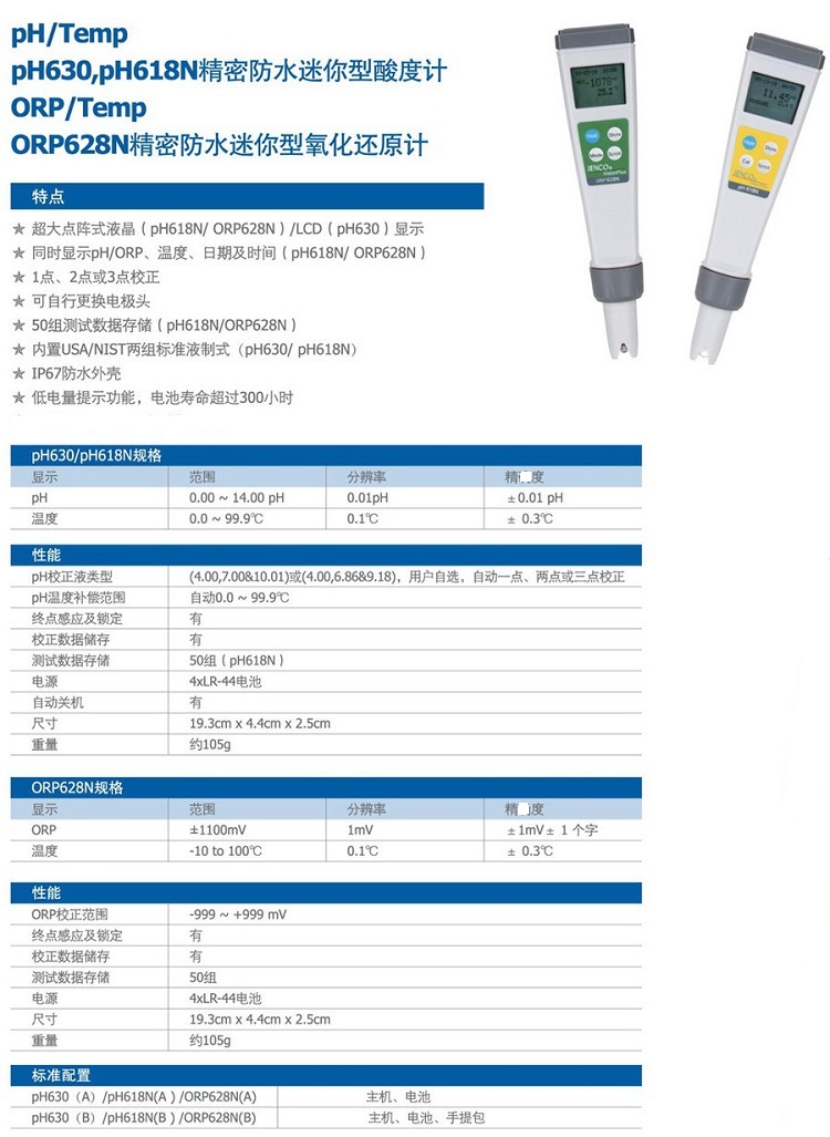 參數:-1200~1200mV/1mV/-999~999mV/1mV(相對值)/IP67防水外殼/可換電極頭/50組數據存儲