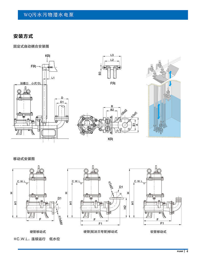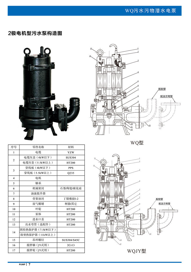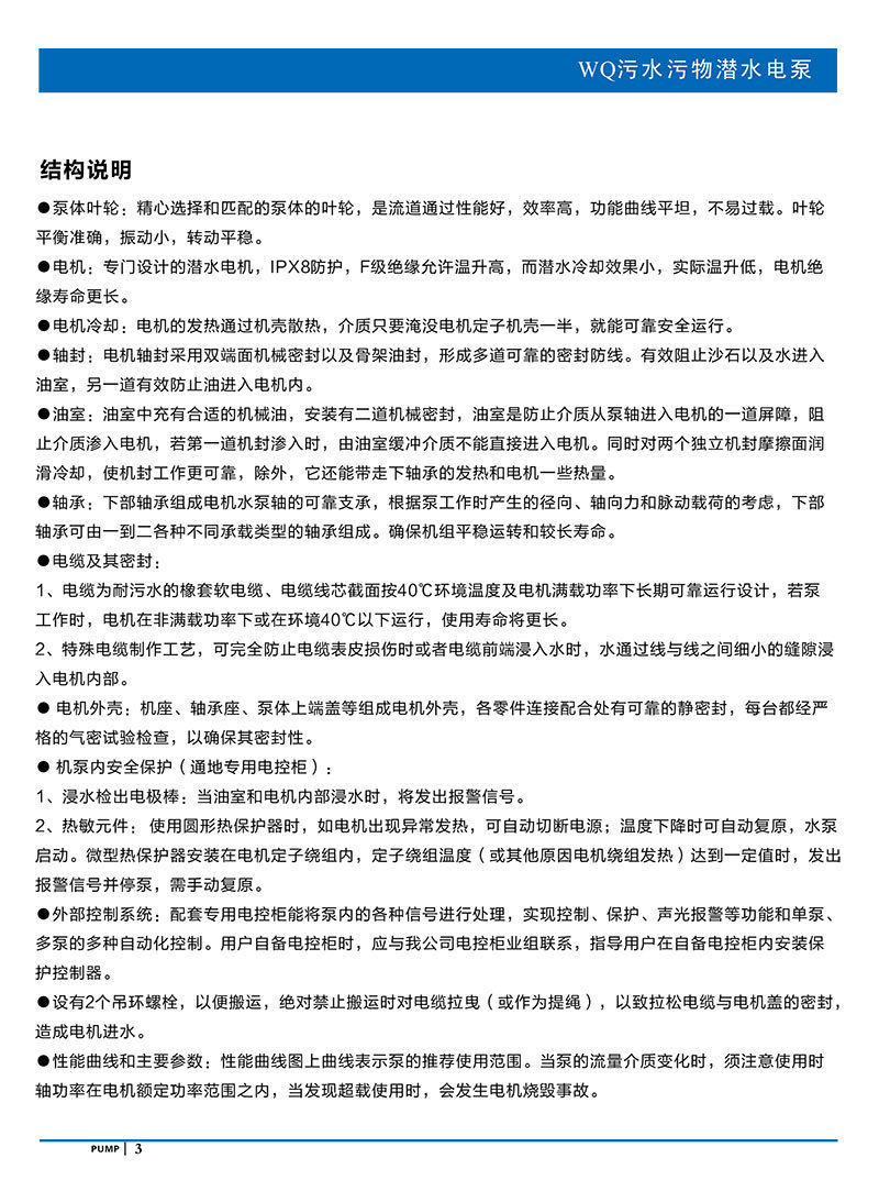 產品說明:南方WQ污水污物潛水電泵由電機與泵兩部分組成,兩者通過油室及機械密封組件隔開,分固定式自動耦合安裝和移動安裝。