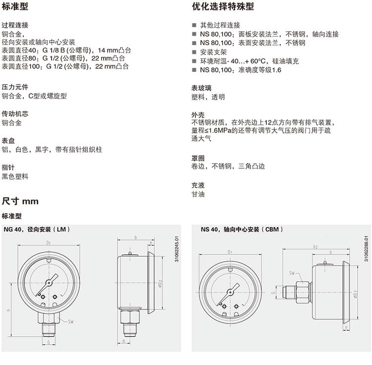 2. 膜片壓力表,化學工業(yè)型,表頭不充液/充液,高過壓保護壓力表,針對UHP應用:422.12 432.50 432.56 423.36 423.25