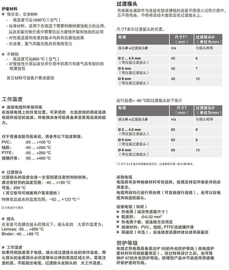 電纜式熱電偶溫度計特別適合需要直接將金屬傳探頭裝配到鉆孔(如在機械部件中)或測量過程的應用(即適用于所有不帶化學侵蝕性介質且無磨損的應用)。要將溫度計安裝到護套中,就需要使用一個彈性卡套接頭將探頭壓入護套底部。這樣可以確保施加在探頭的力度不超過臨界值。標準型電纜式熱電偶溫度計不帶過程連接件,不過可使用螺紋接頭、活動螺母等緊固件進行連接。