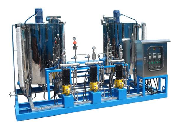 固體藥劑加入溶藥箱內(nèi),然后按比例加入除鹽水或凝結(jié)水?dāng)嚢枞芙猓捎嬃客都酉到y(tǒng)加到鍋爐汽包內(nèi),投加控制可采用手動方式,也可依據(jù)上位系統(tǒng)輸出的控制信號,進行隨動控制,自動投加。